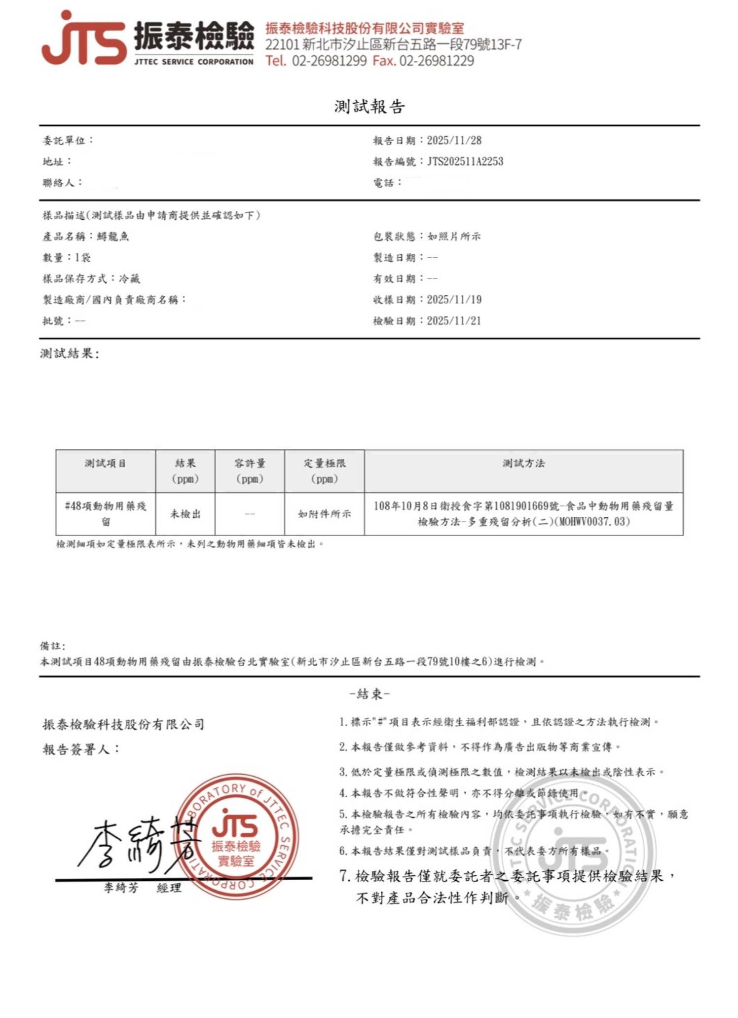 食材『鱘龍魚』-SGS檢驗報告