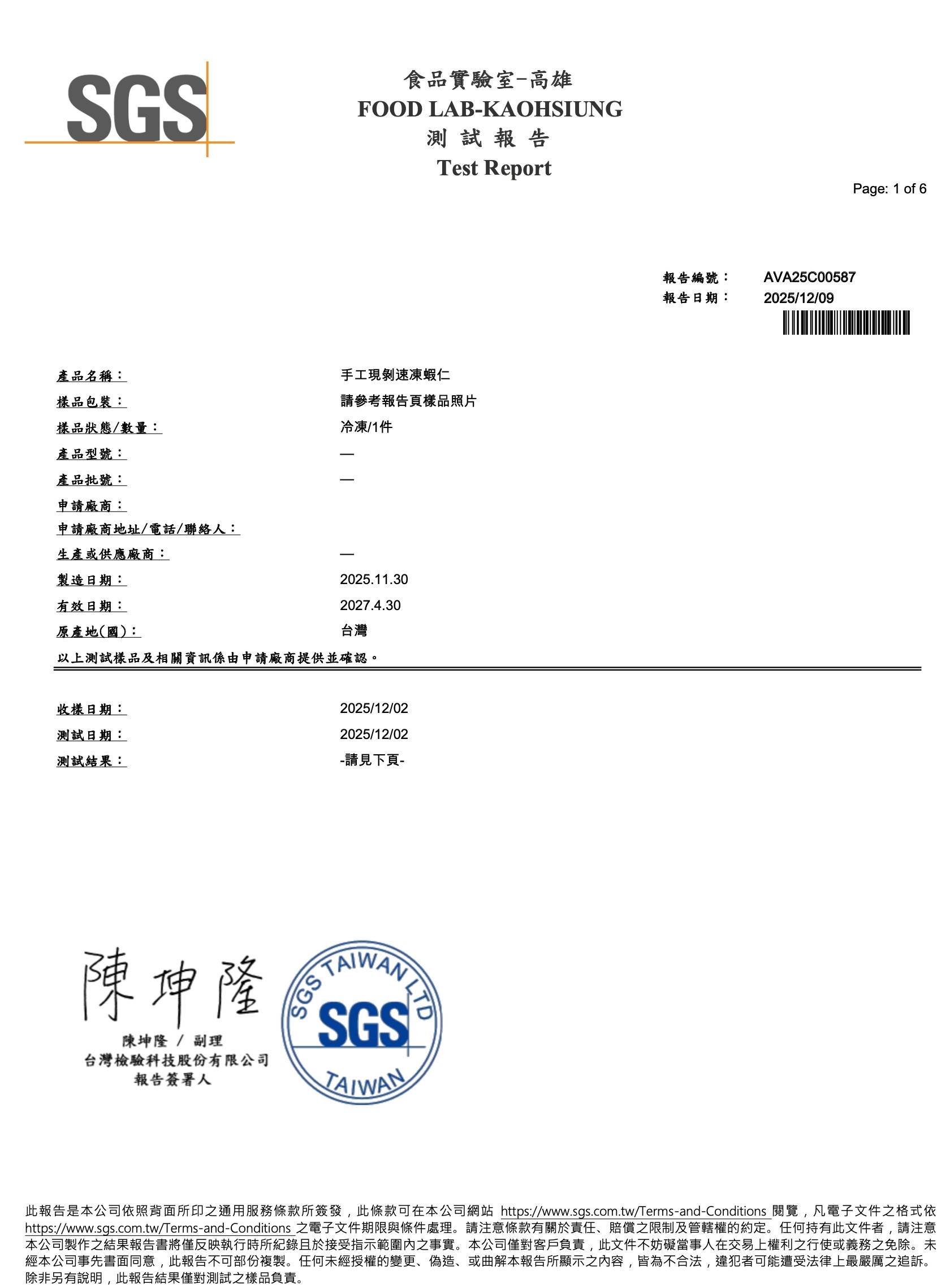 食材『特大蝦仁』-SGS檢驗報告
