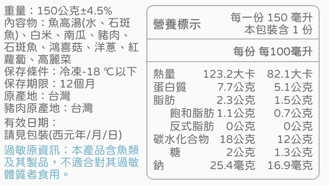 ●成分:魚高湯[水、石斑魚]、白米、南瓜、豬肉、石斑魚、鴻禧菇、洋蔥、紅蘿蔔、高麗菜