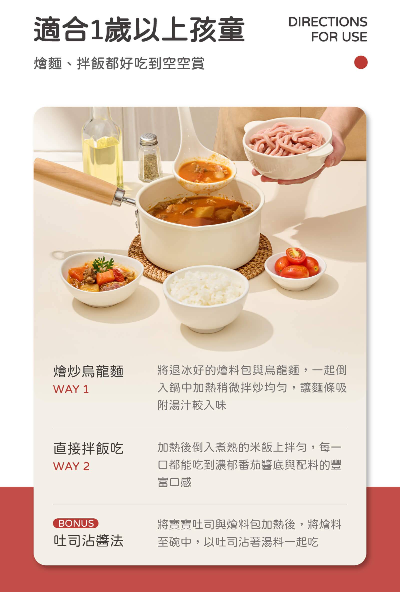 ●成分:水、牛腩、番茄、洋蔥、馬鈴薯、豬肉、洋菇、番茄醬[水、番茄糊、蔗糖、釀造醋、食鹽、香辛料(白胡椒、肉桂、紅辣椒、薑、丁香、肉豆蔻、芥末、月桂葉、眾香子)]、橄欖油、番茄糊、蒜、中筋麵粉、義大利香料(奧勒岡葉、羅勒葉、迷迭香葉、蒜粒、紅辣椒、馬郁蘭葉、洋香菜葉)、碘鹽